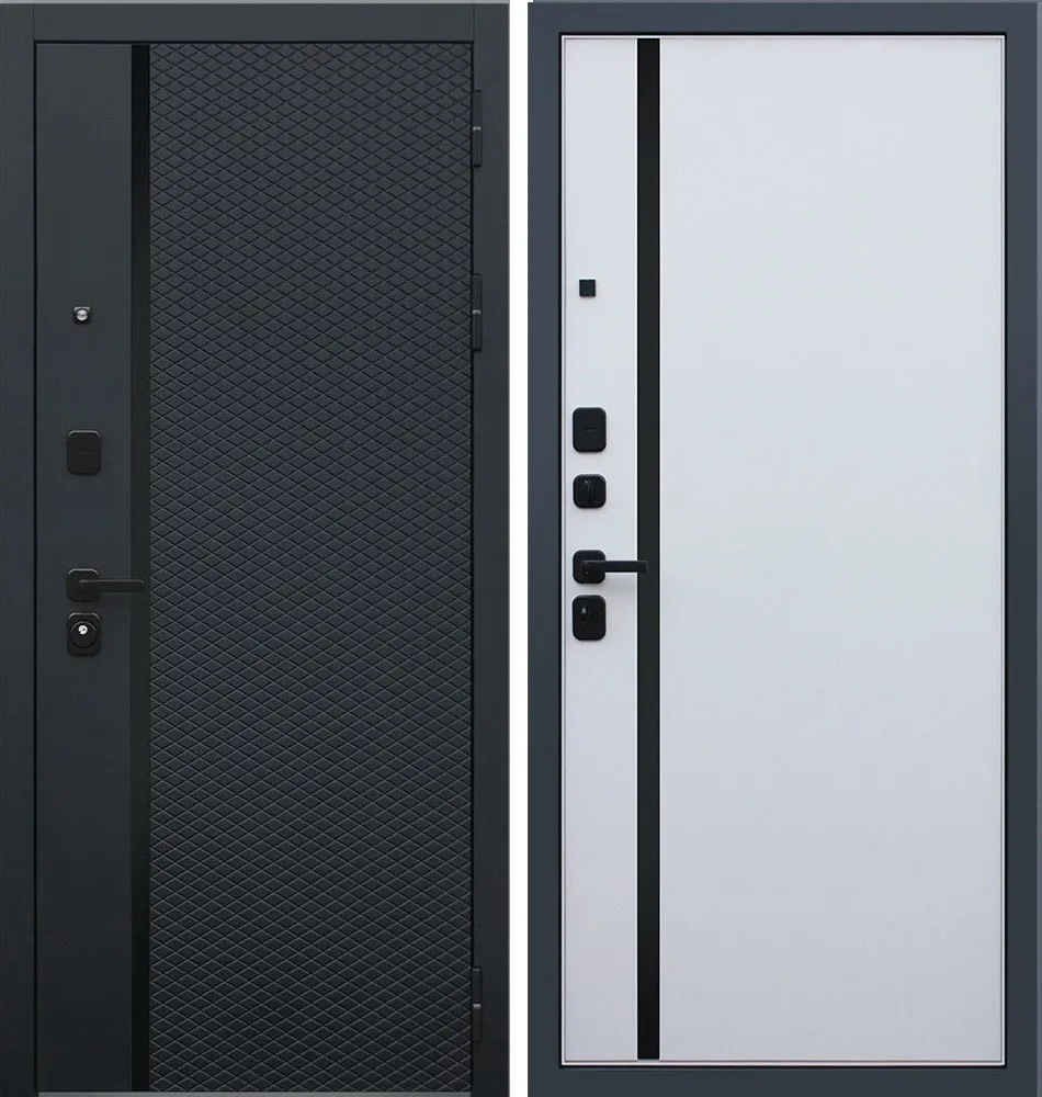 Порошковое покрытие "муар черный". Экошпонированная панель МДФ 10 мм (дизайн ФЛС). Цвет "черный кварц". Вертикальная вставка из черного глянцевого лакобеля. Объемная фрезеровка. Наличник МДФ гладкий, 80 мм.