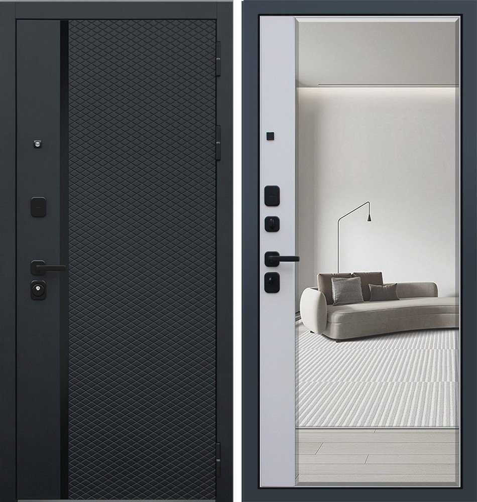 Порошковое покрытие "муар черный". Экошпонированная панель МДФ 10 мм (дизайн ФЛС). Цвет "черный кварц". Вертикальная вставка из черного глянцевого лакобеля. Объемная фрезеровка. Наличник МДФ гладкий, 80 мм.